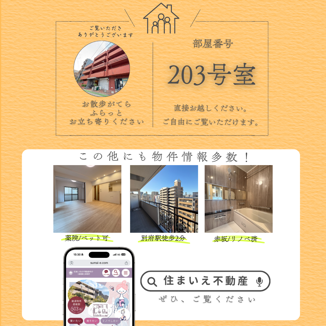 オープンルーム開催♪ 物件ページ:https://www.sumai-e.com/article/detail/5008850/ 2/1(日) ◆開催時間 13:00~17:00 スタッフがお部屋におります、ふらりお立ち寄りください♪ ◆こんな方におすすめのイベントです◇ 1) 中央区でお探しの方 2) 利便性の良いお部屋をお探しの方 3) 広いお部屋をお探しの方 4) これから中古マンション購入をご検討される方 5) きれいなお部屋に住みたい方 ◆開催場所 中央区薬院2丁目17-1-203 ライオンズマンション薬院第2 203号室 ご予約いただきますとスムーズにご覧いただけます♪ フリーダイヤル 0120-999-045 LINEからもお気軽にお問い合わせくださいませ。 https://lin.ee/19F4JU7